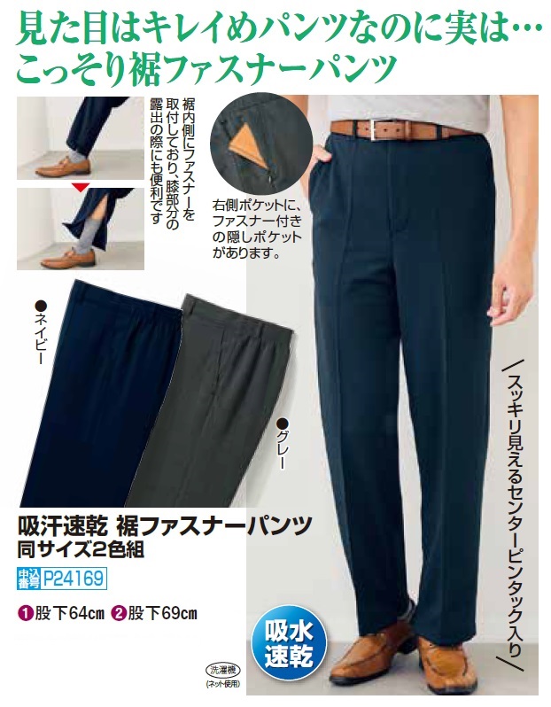 吸汗速乾 裾ファスナーパンツ 2色組 選べる股下丈 スラックス ズボン メンズ 紳士服 シニア 男性 ネイビー グレー シンプル 紺色 灰色 裾 チャック付き 裾開き 通院 ひざが出せる 40代 50代 60代 70代 80代 父の日 お父さん