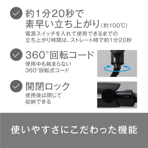 ツヤのあるまとまり。2wayのコンパクトストレート。 ■電源方式:交流式 ■電源・電圧:AC100〜240V(自動電圧切替付)50-60Hz ■消費電力:20W ■アイロン部温度:約160℃(100V時)/約170℃(240V時) ■ヒートアップ(約100℃):約1分20秒 ■仕上がり:ストレート/カール ■海外使用:○※1 ■コーティング:グロスコーティング ■本体寸法:高さ24.2×幅3×奥行3.7 cm ■質量:約265 g ■コードの長さ:約1.7m(360° 回転式コード) ■生産国:タイ ※1 海外でご使用の場合には、国や地域に合わせて別途プラグアダプターをお買い求めください。 ※記載は商品仕様の一部です。仕様説明不足等の理由での返品はできません。特に適合等は必ずご確認ください。