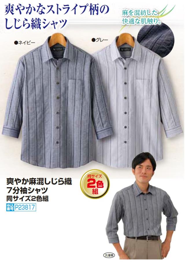 シャツ 七分袖 ネイビー グレー ストライプ メンズ シニア 爽やか麻混しじら織 7分袖シャツ 2色組 カジュアルシャツ ストライプ柄 紳士服 男性 シンプル しじら織り 麻入り 紺色 灰色 ファッション 50代 60代 70代 80代 父の日 お父さん 春夏 2枚セット uka p23817 p26471