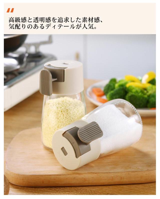 | 自動計量機能付き ワンプッシュタイプ 0.5g/回 使いやすい密閉できワンプッシュ出す調味料入れ ワンプッシュ2gの食塩が出るので、自分の塩分量をしっかり把握できる ワンプッシュで定量の調味料を出せますので、作業がとってもスムーズ 高級感と透明感を追求した素材感、気配りのあるディテールが人気 体に優しいガラス・PP素材を採用するので、安心してご使用 開口部が広く、調味料の補充がラクラク♪ しっかり閉まって中の調味料が固まりにくい | |