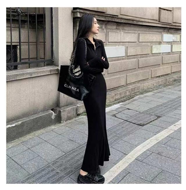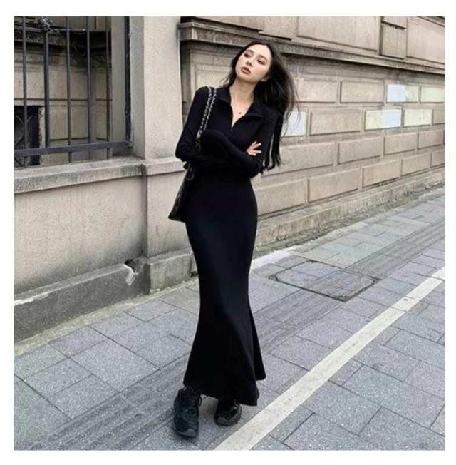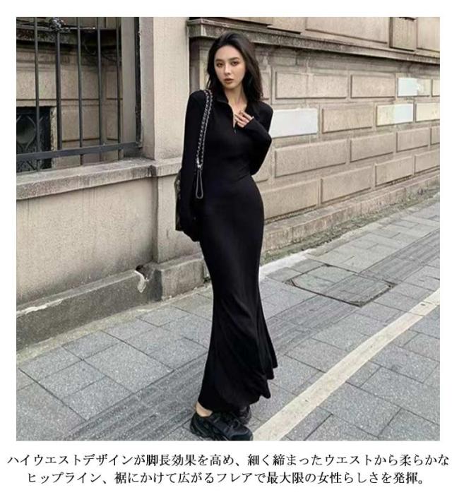 マーメイド ワンピース マーメイドライン ロングワンピース Vネック マキシワンピース マーメイドワンピース ハーフジップ 折り襟 長袖 タイトワンピース 着?せ フェミニン きれいめ S M L XL 2XL