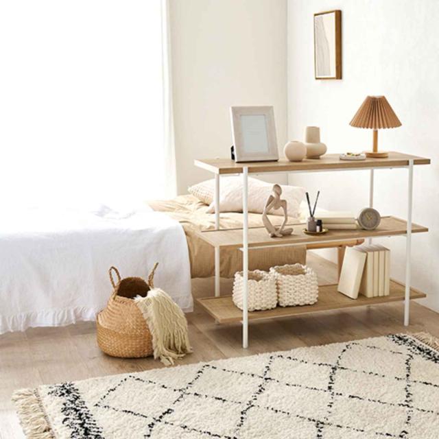 ディスプレイラックとしてはもちろん、ごちゃごちゃしがちなベッド周りに使うとスッキリまとまります。
