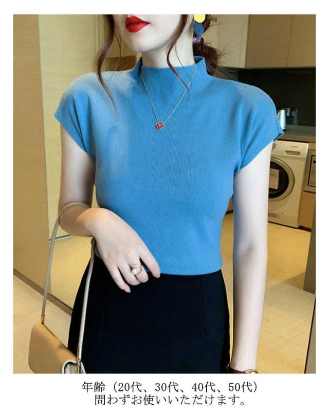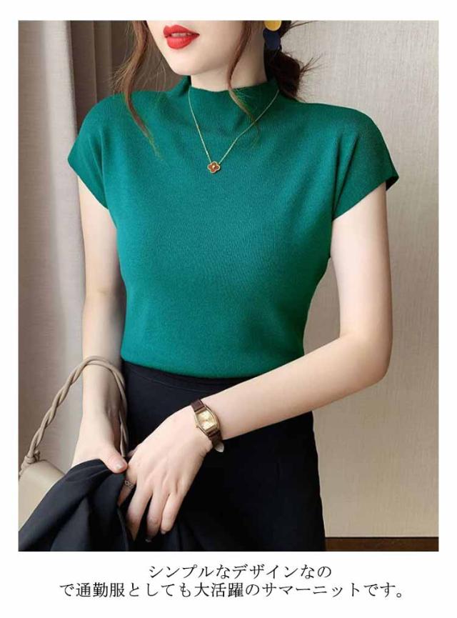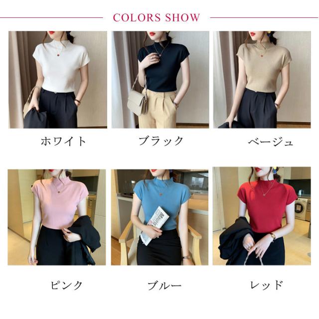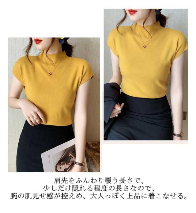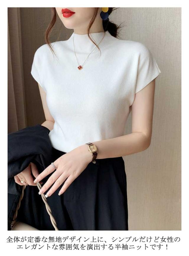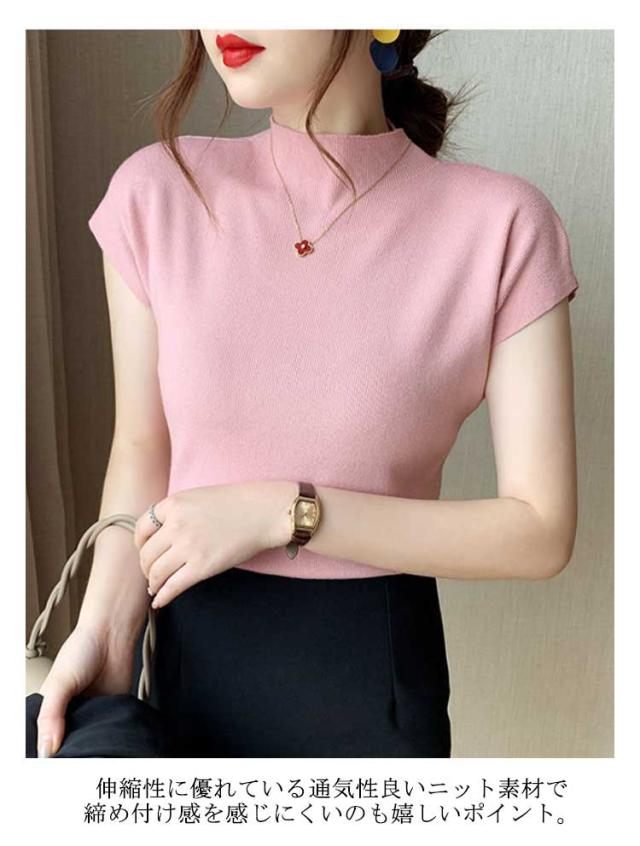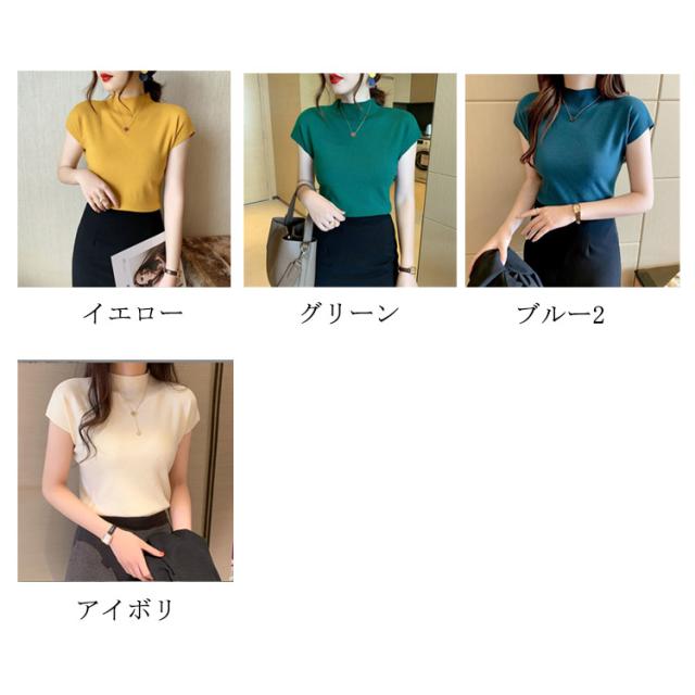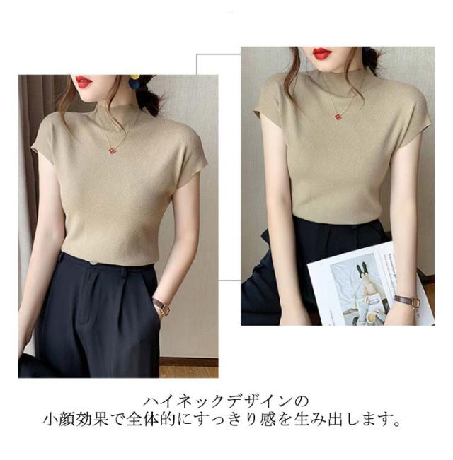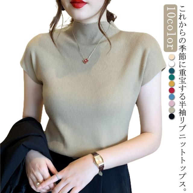 ニット トップス ハイネック ニット トップス サマーニット レディース 半袖 リブニット 通勤 ハイネック カットソー フレンチスリーブ フィット オフィスカジュアル 半袖ニット 薄手 無地 きれいめ 上品 大人 tシャツ 春夏 春 夏 春服 夏服 送料無料