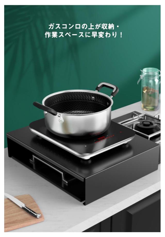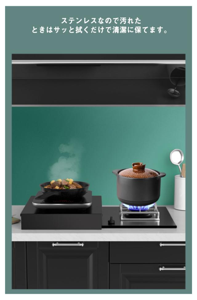 | 組立いらずで着いたらすぐに使えます。ガスコンロの上が収納・作業スペースに早変わり! 調理中のちょい置きはもちろん、配膳台としても活躍します。 IHコンロやホットクック、電気圧力鍋などの置き場所としても使えます。 使うときは右または左又は後ろに立てておけるのでちょっとして油ハネガードにもなります。 ステンレスなので汚れたときはサッと拭くだけで清潔に保てます。 錆や汚れに強く掃除も簡単で長持ちします! | |