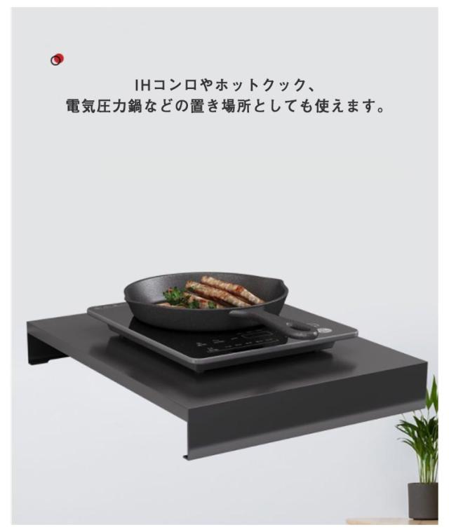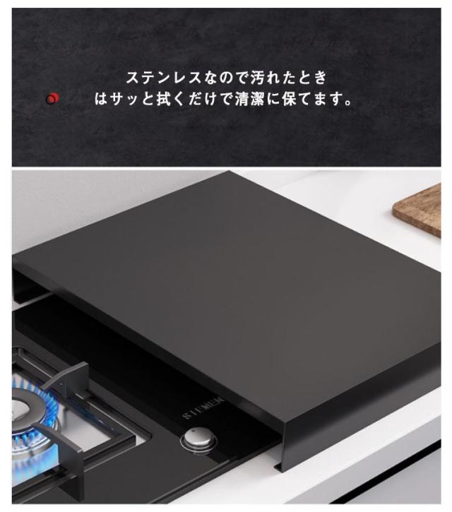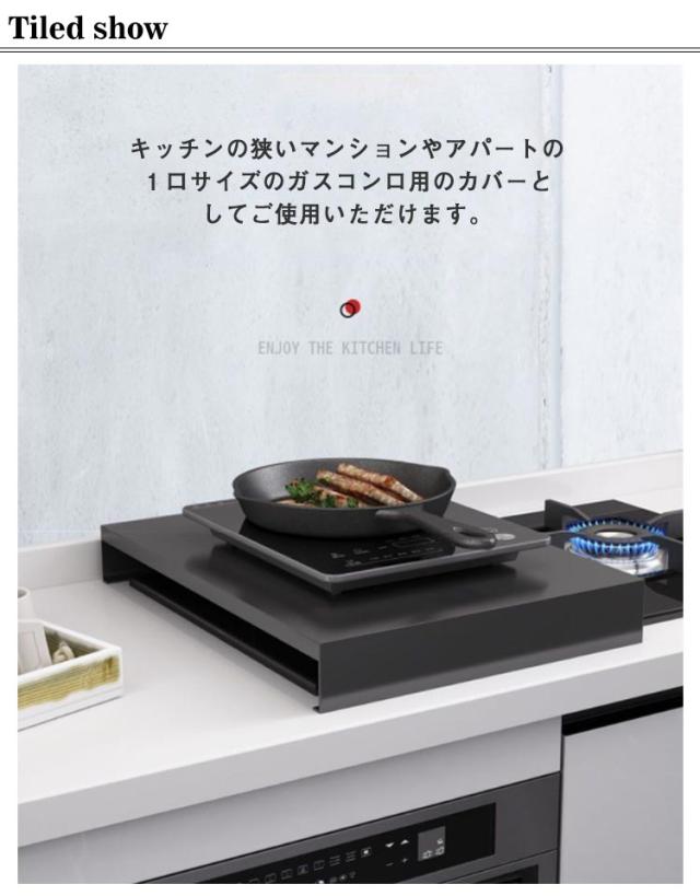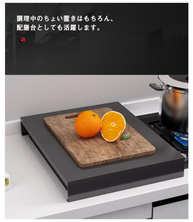 | ガスコンロの上置くだけで収納・作業スペースに早変わり!組立いらずで着いたらすぐに使えます。 キッチンの狭いマンションやアパートの1口サイズのガスコンロ用のカバーとしてご使用いただけます。 または、2口コンロをご使用のお宅でも、片側の1口をカバーすることで調理台の延長としても使えます。 調理中のちょい置きはもちろん、配膳台としても活躍します。 IHコンロやホットクック、電気圧力鍋などの置き場所としても使えます。 使うときは右または左又は後ろに立てておけるのでちょっとして油ハネガードにもなります。 ステンレスなので汚れたときはサッと拭くだけで清潔に保てます。 天板耐荷重は約50kg! | |
