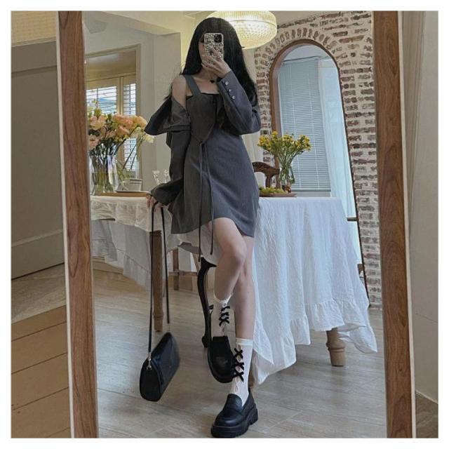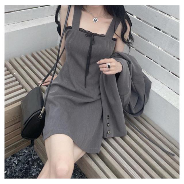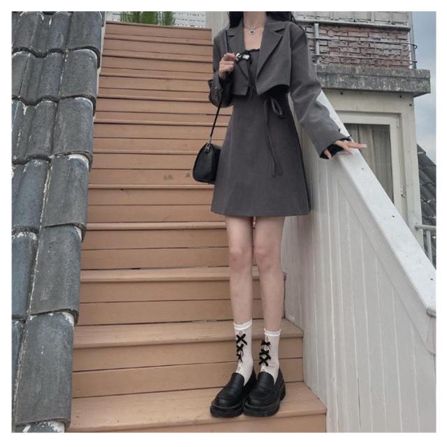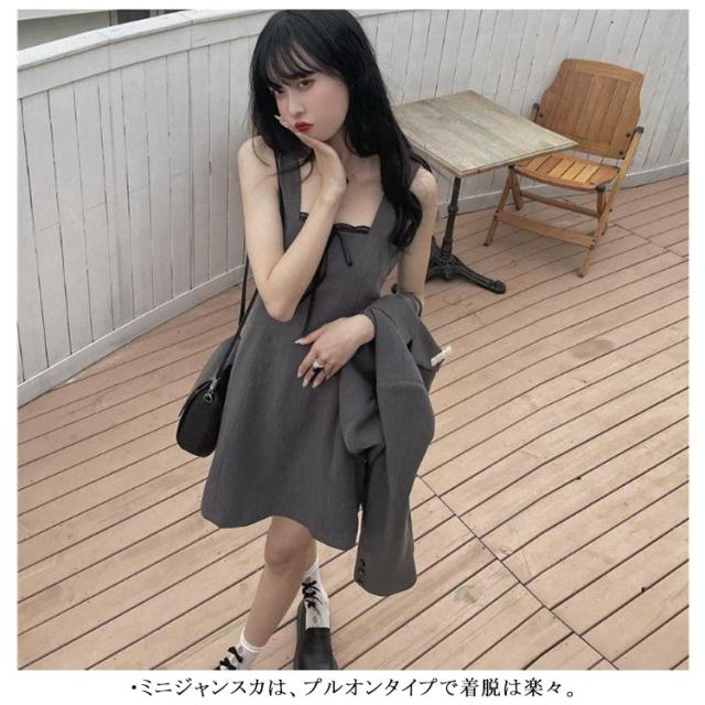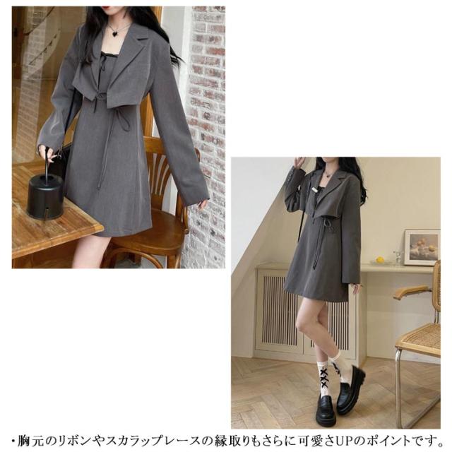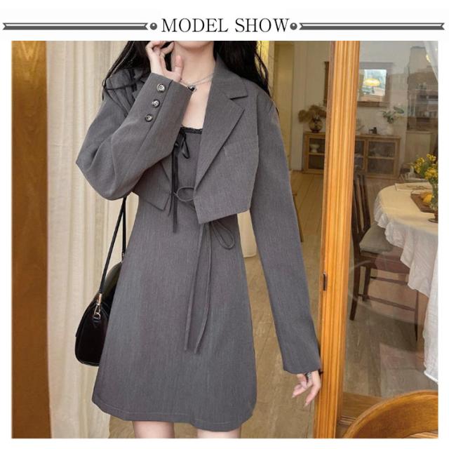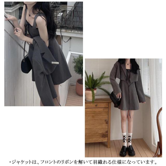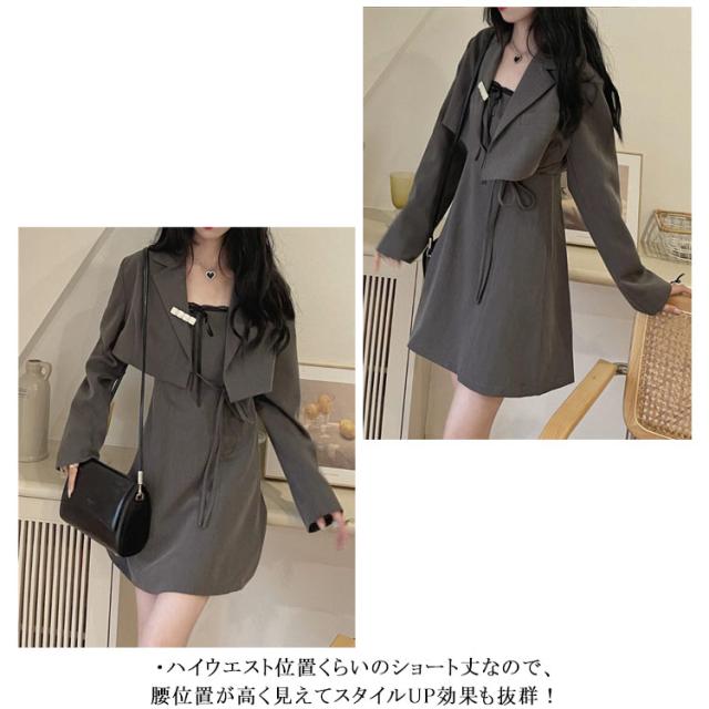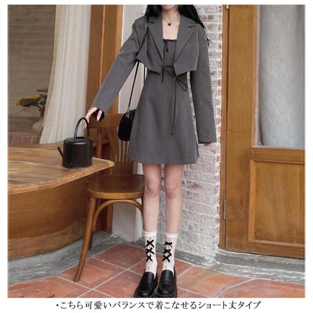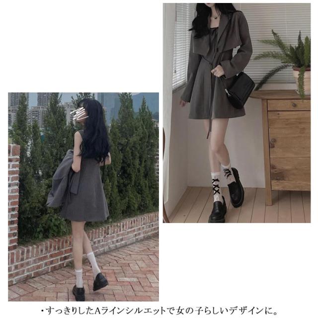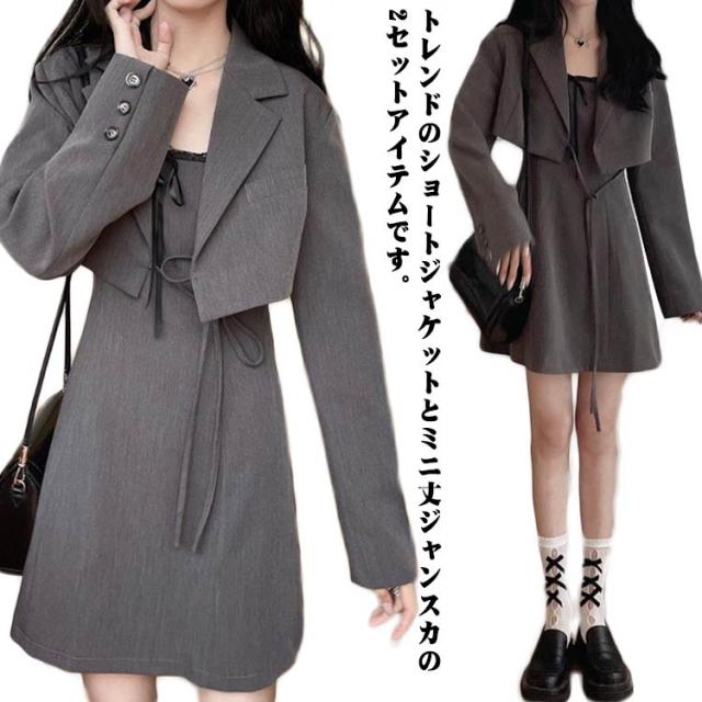 ワンピーススーツ 上下2点セット ショートジャケット&ミニジャンスカ レディース ショート丈ジャケット 長袖 プルオンワンピース Aライン ノースリーブ 袖なし 女子 薄手 可愛い 無地 グレー 春 夏
