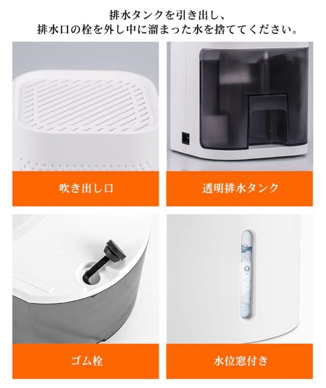 | お部屋のインテリアに調和するシンプルかつコンパクトな除湿機です。 タンクが満水になると電源ボタンが点滅し、自動で運転を停止します。 電源ボタンが点滅したらタンクの排水を行って下さい。 排水タンクを引き出し、排水口の栓を外し中に溜まった水を捨ててください。 デザイン性も高いので、クローゼットや窓際、靴箱など、場所を選びません。 使い方もシンプルなので、機械操作が苦手な方でも簡単にご利用いただけるので嬉しいですね。 | |