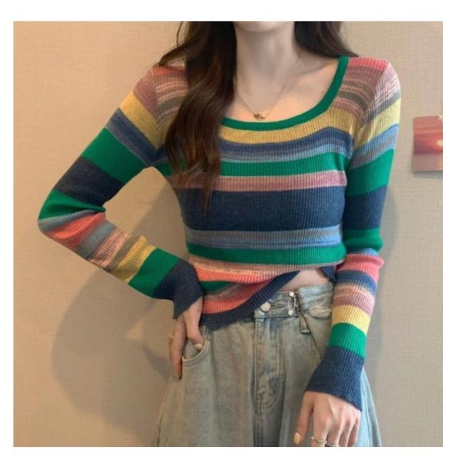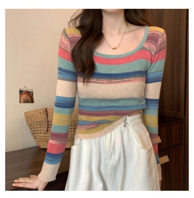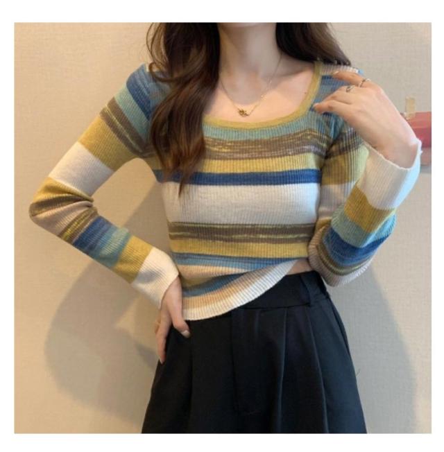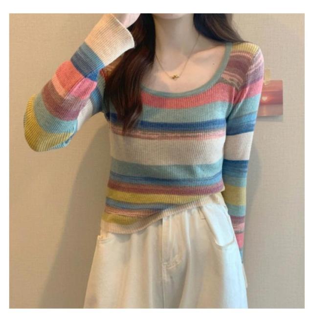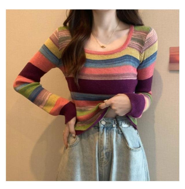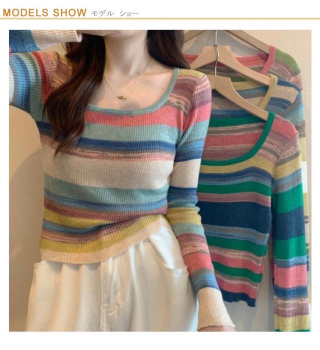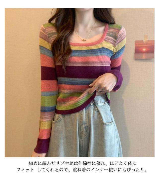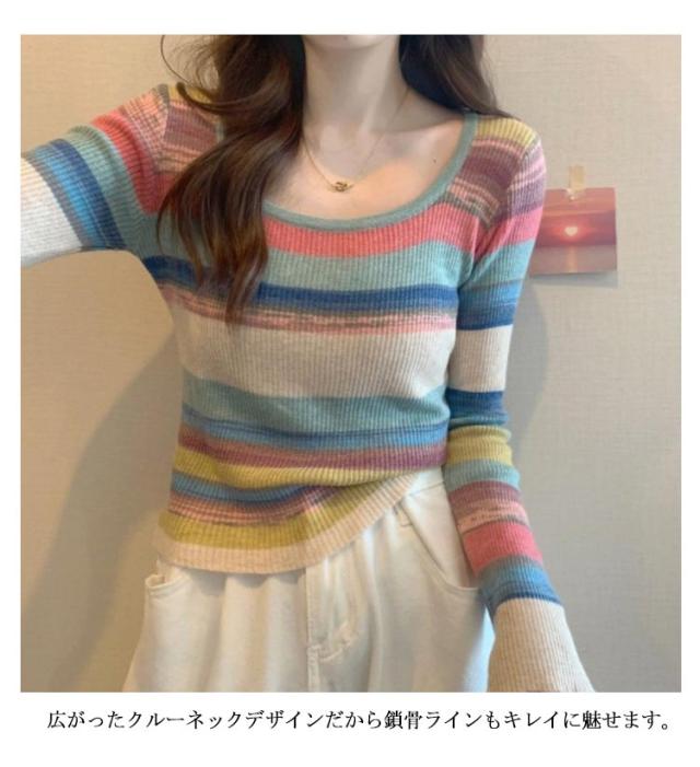 ニット レディース スクエアネック 送料無料 クルーネック 虹柄 リブニット ニットトップス 長袖 薄手 マルチカラー ボーダー柄 ニットソー コンパクト 可愛い 春 秋