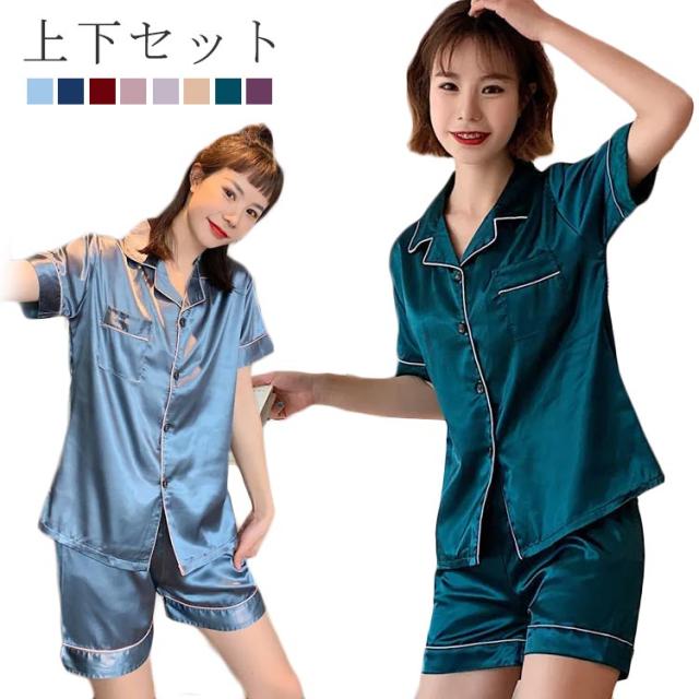 ルームウェア ナイトウェア パジャマ 上下セット 部屋着 セットアップ シルク風 ひんやり 光沢 ショートパンツ パンツ レディース 寝間着 薄手 夏 40代 20代 50代 30代 2点セット 無地 半袖 送料無料