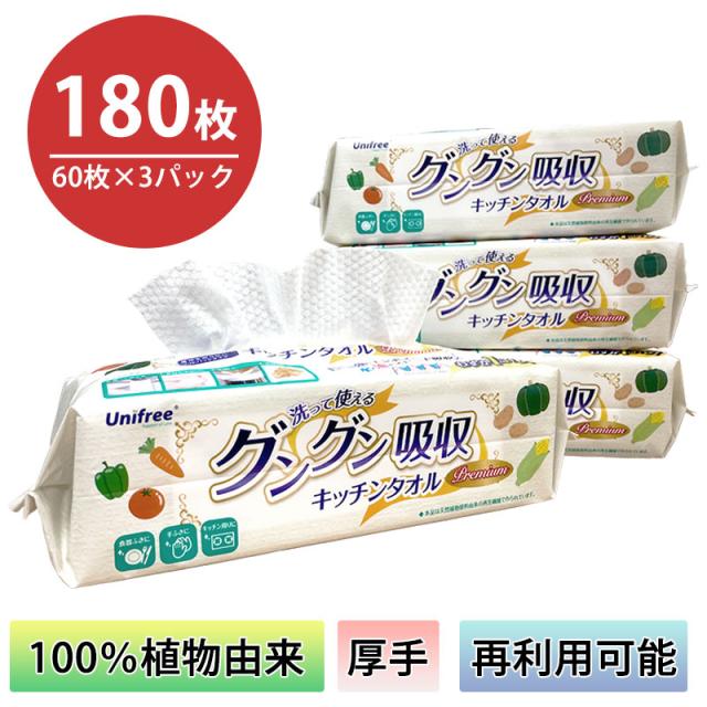 グングン吸収 キッチンタオル 180枚 60枚入 3袋 厚手 ペーパータオル 繰り返し使える 洗って使える 使い捨て キッチンペーパー キッチンタオル 送料無料 お手拭き スピード吸収 Unifree ユニフリー