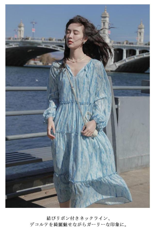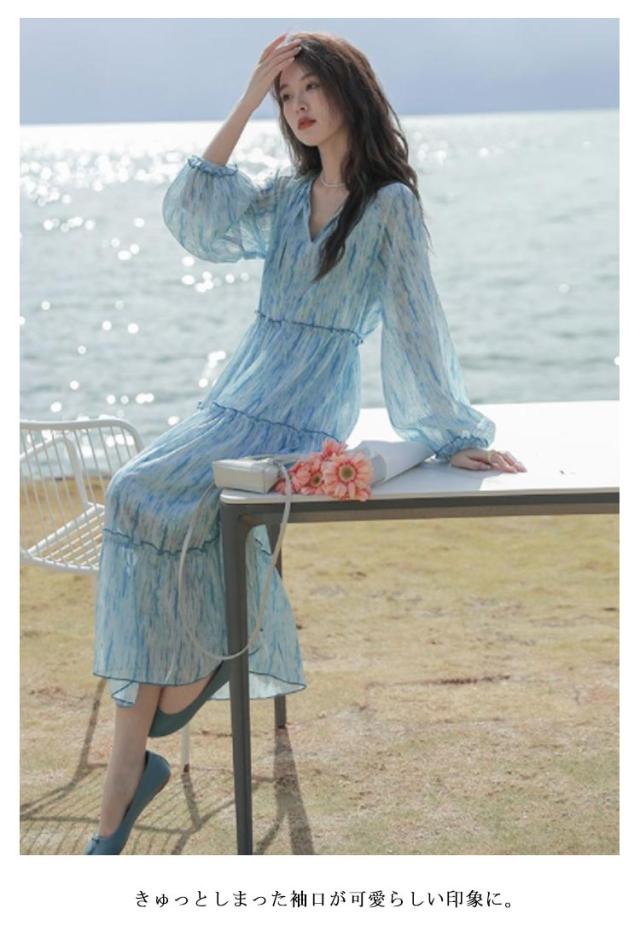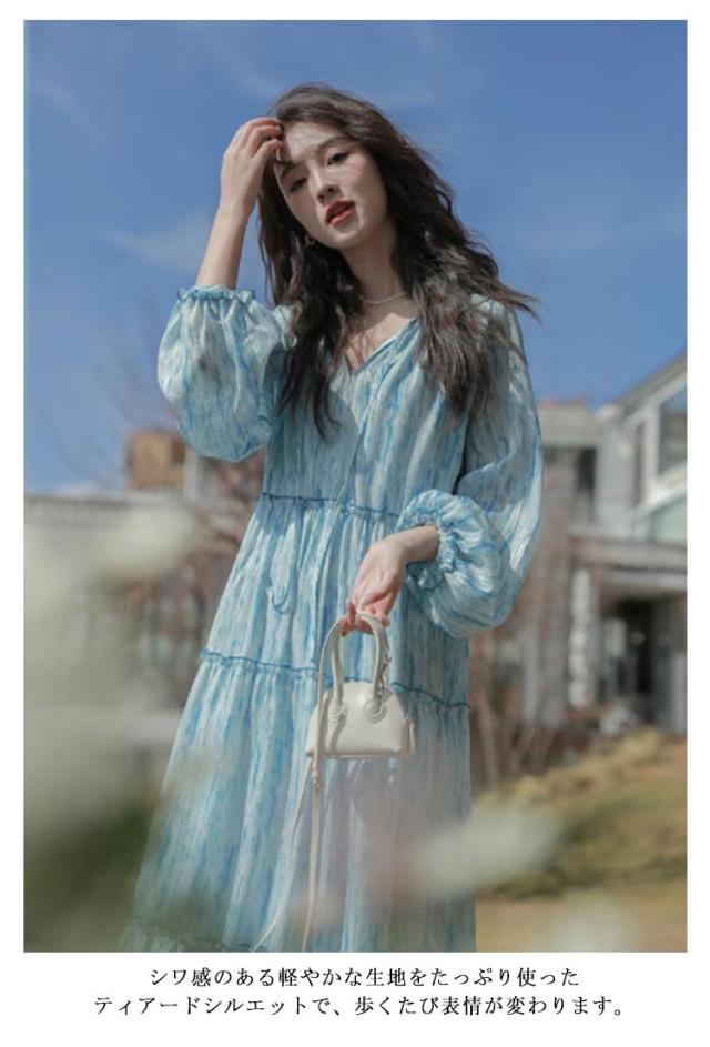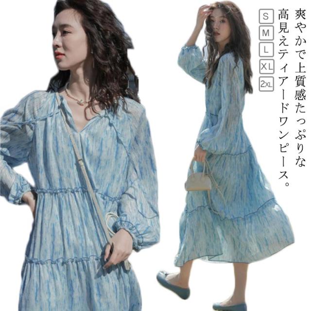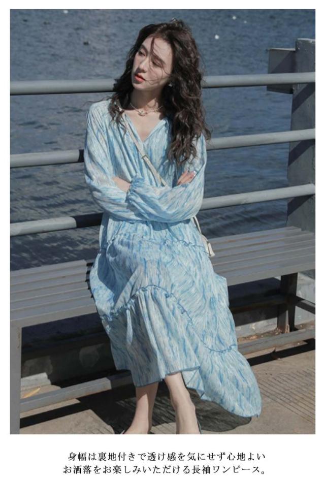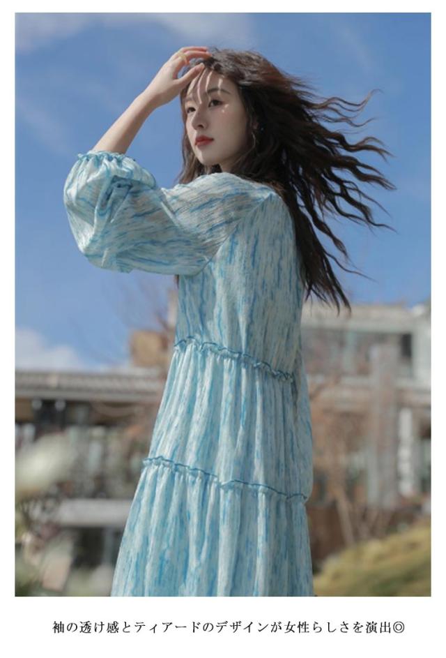 ロングワンピース シアー ワンピース 長袖 ティアードワンピース 透け感 マキシ丈 ロングワンピース 送料無料 結婚式 披露宴 旅行 レジャー ビーチ 海 ブルー ストライプ シワ感