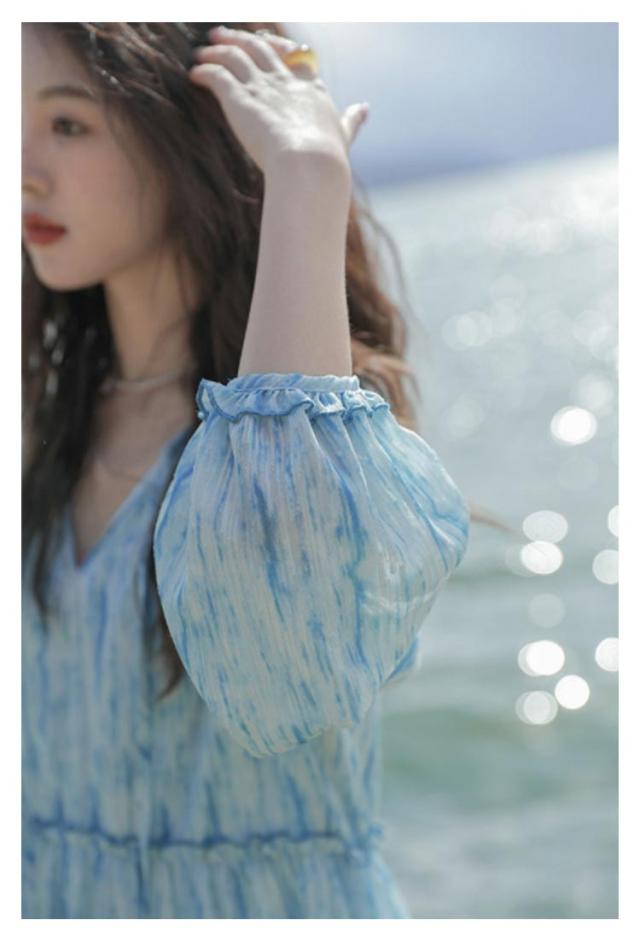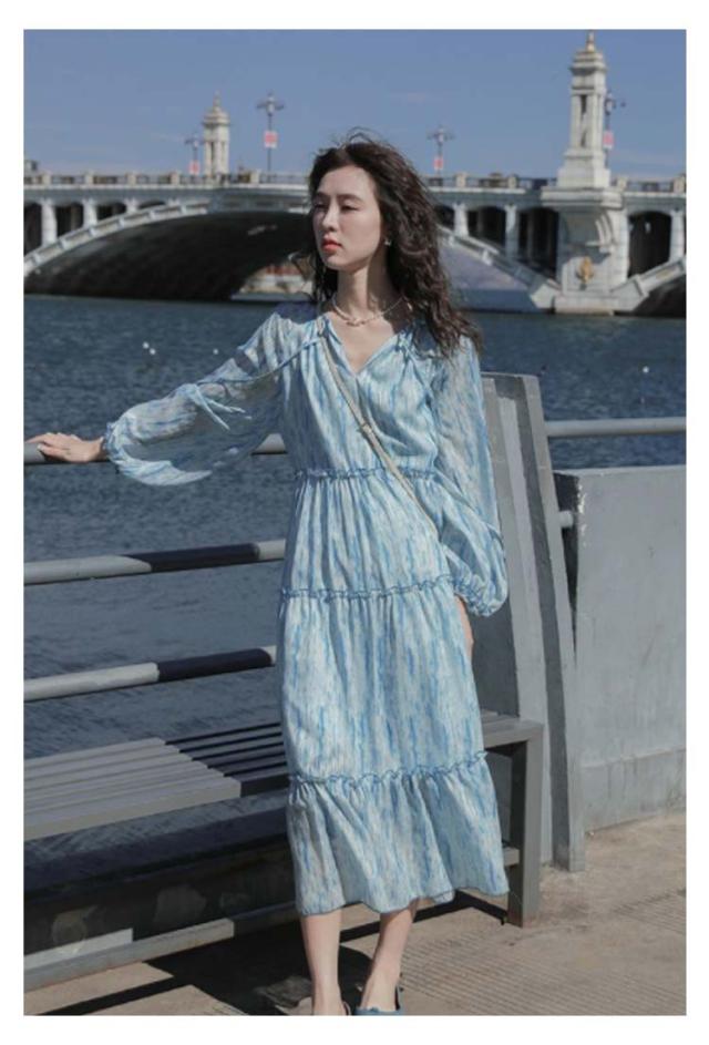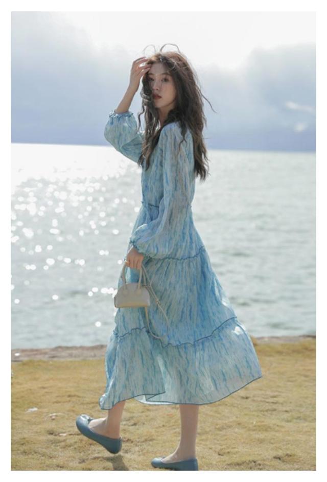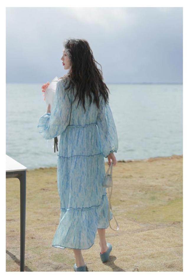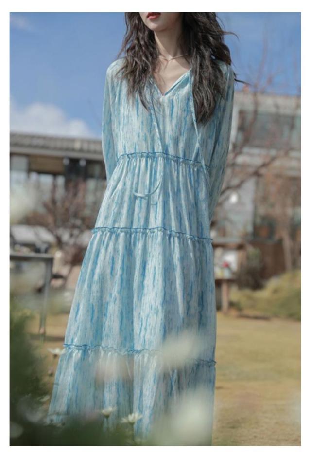 ロングワンピース シアー ワンピース 長袖 ティアードワンピース 透け感 マキシ丈 ロングワンピース 送料無料 結婚式 披露宴 旅行 レジャー ビーチ 海 ブルー ストライプ シワ感