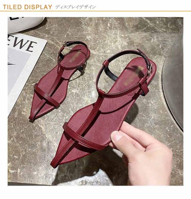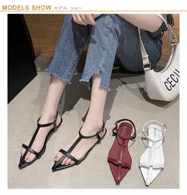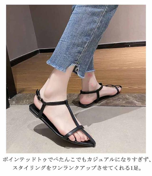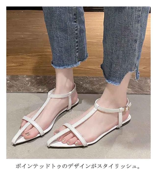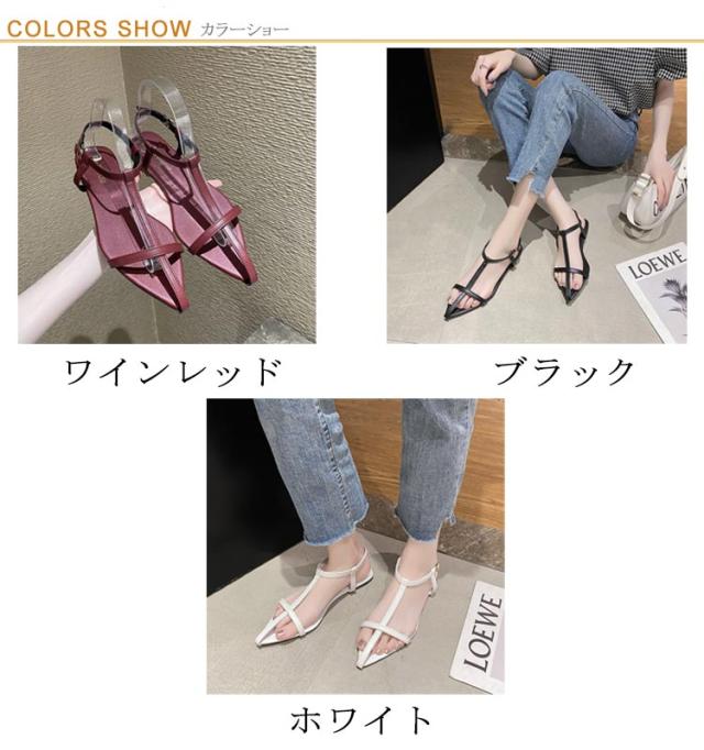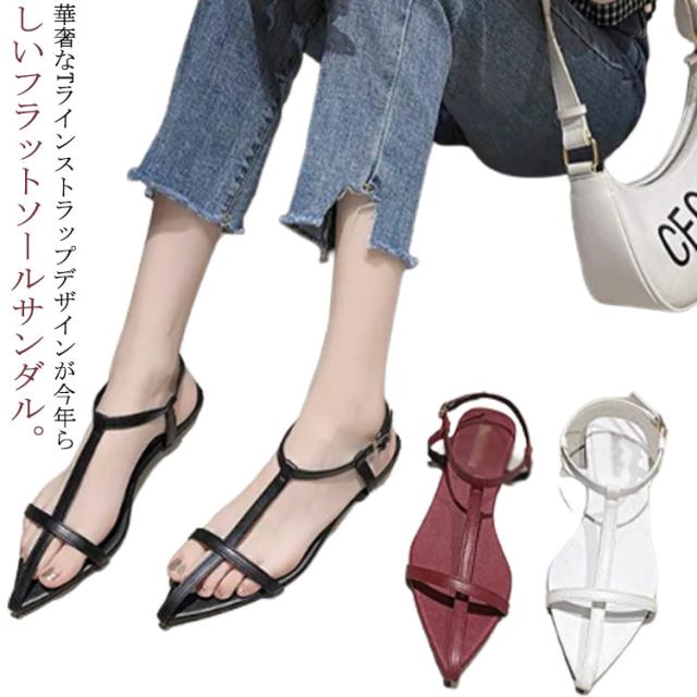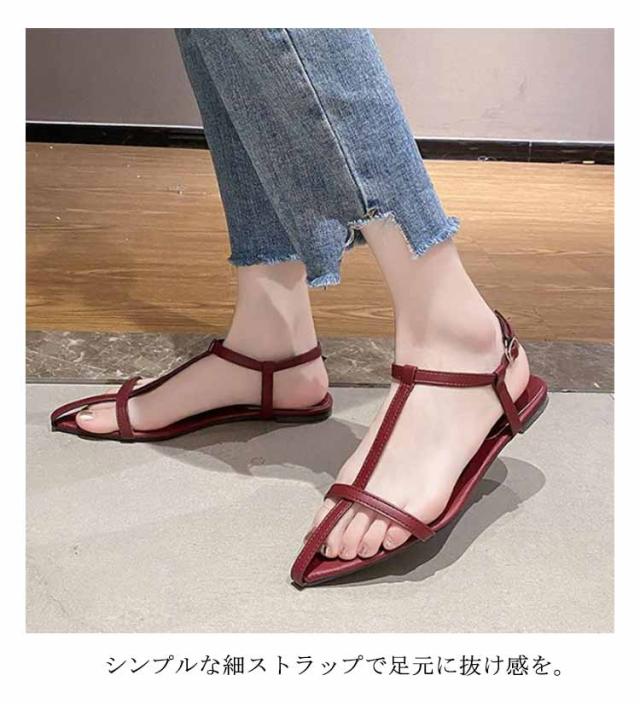 Tライン ストラップサンダル レディース ぺたんこ 細ストラップ 華奢 Tストラップ ポインテッドトゥ フラットソール ぺたんこ くつ シューズ 履きやすい 脱げない 高見え トラベル 旅行 リゾート ブラック ホワイト ワインレッド