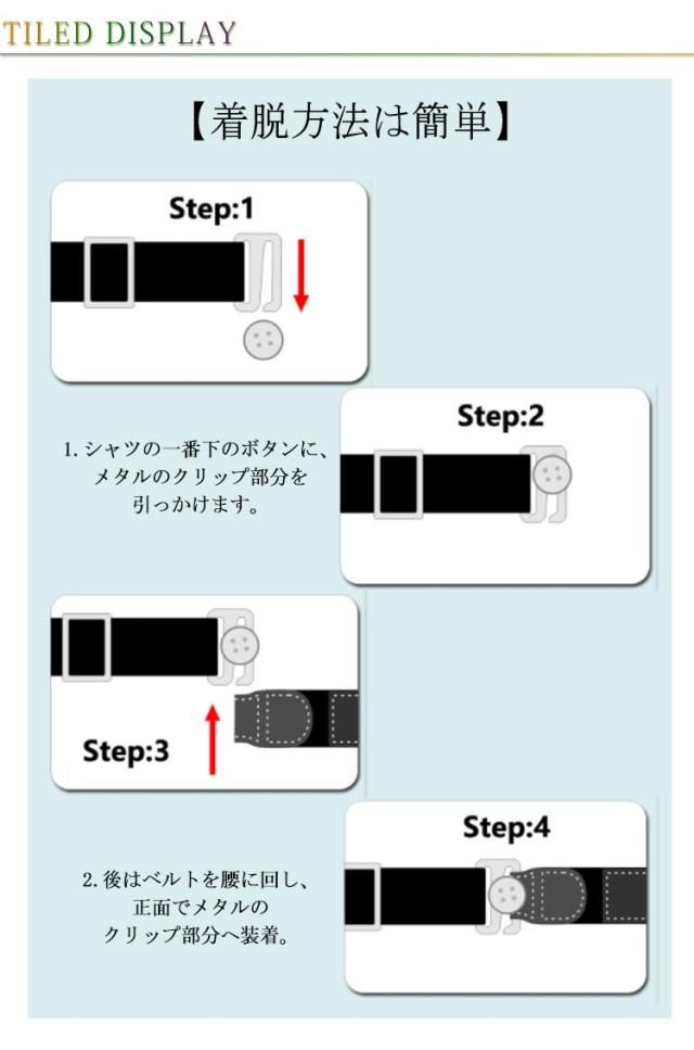 | ・動いてもシャツがはみ出さない、シャツずれ防止ベルトです。 ・座ったり、立ち上がったり、動いてもシャツが飛び出すのを防ぎます。 ・シワがない、ピンと張ったシャツで、スーツの着こなしをワンランクアップ! ・伸縮性の高いゴムのため着け心地よく、苦しくなりません。 ・アジャスター付きだからサイズ調節も可能です。 ・ベルトを装着してからズボンを履けば外からは見えません。 ・軽量設計で、すっきりしたシンプルなデザインだからかさばりません。 ・大事なビジネスシーン、結婚式や卒業式、入学式などの式典、パーティー等しっかり決めたい時におすすめ。 【着脱方法は簡単】 1.シャツの一番下のボタンに、メタルのクリップ部分を引っかけます。 2.後はベルトを腰に回し、正面でメタルのクリップ部分へ装着。 ※男性、女性ともにご着用可能となります。 | |