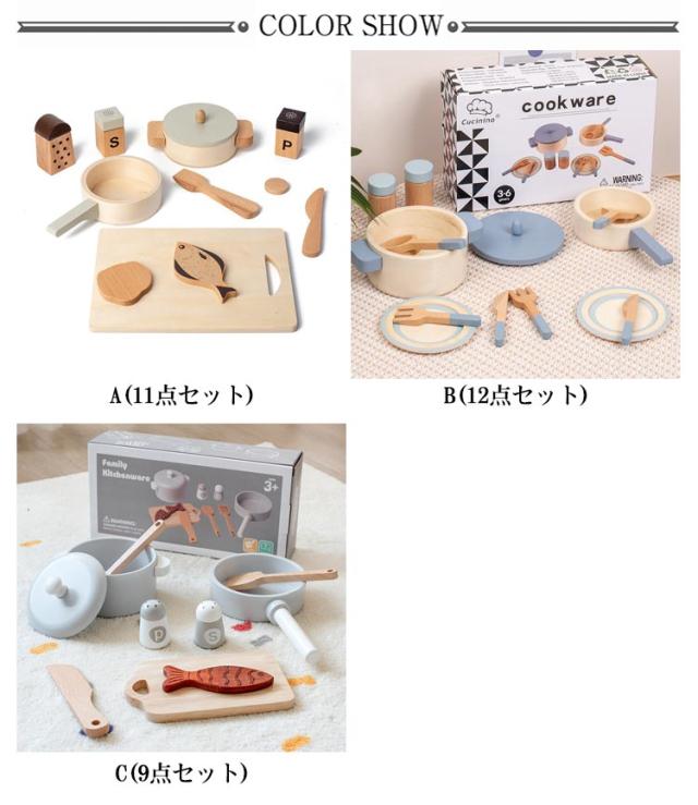 | サイズについての説明 | 【商品仕様】 【A/11点セット】セット内容:鍋(蓋付き)、フライパン、フライ返し、包丁、塩、コショウ入れ、調味料ボトル、お魚、お肉×2、まな板 【B/12点セット】セット内容:鍋(蓋付き)、お皿×2、フライパン、フライ返し、スプーン、ナイフ×2、フォーク×2、塩入れ、コショウ入れ 【C/9点セット】セット内容:お魚、塩、コショウ入れ、包丁、フライ返し、へら、まな板、フライパン、鍋(蓋付き) 【対象年齢】4歳〜 |