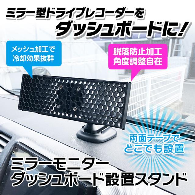 ミラー型のドライブレコーダーを使いやすい位置に取り付けるダッシュボードスタンドです。ミラー型のドライブレコーダーが大きすぎて視界が悪い、純正の防眩ルームミラーをそのまま利用したい方々にオススメ!ゴムバンド取付タイプのデジタルルームミラーをオンダッシュ化できるスタンドです。
