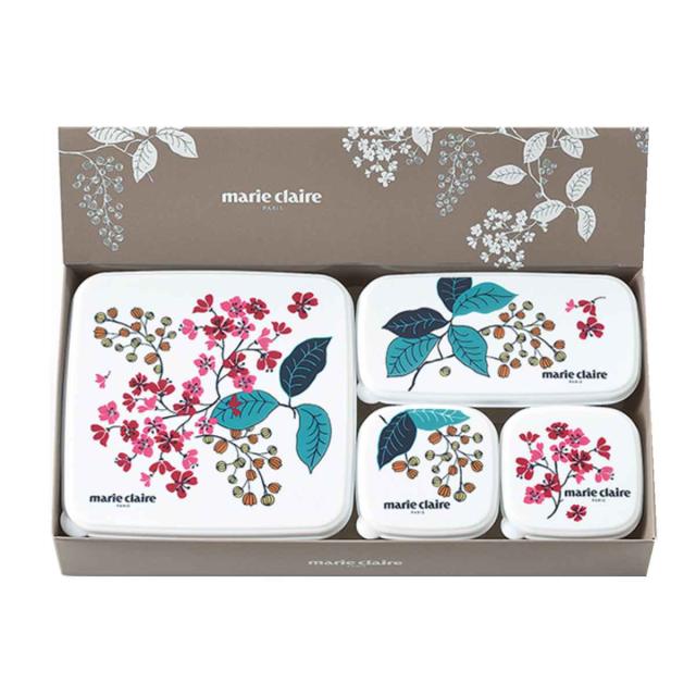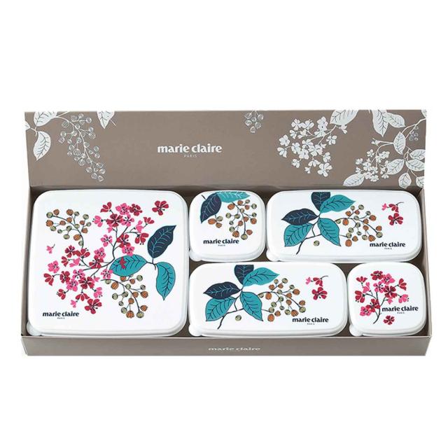 マリ・クレールのフレンチライラックシール容器5個セット(正角型130ml×2個、長角型290ml×2個、正角型610ml×1個)です。優美な花のモチーフが鮮やかでキッチンを明るくしてくれます。化粧箱入りなので贈り物にもおすすめです。安心の日本製です。