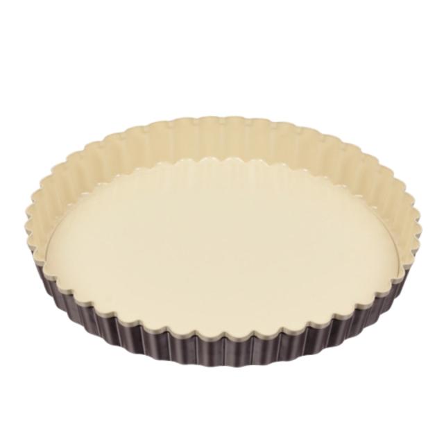 こびりつきにくくお手入れが簡単な、ふっ素樹脂加工のタルト型です。イギリスCCC社で開発された、日本初上陸の新カラーふっ素材を使用し、金属加工の町、新潟県燕三条地区で成形しています。底取れ式なので、焼きあがったケーキを簡単に取り出すことができて便利です。タルトやアップルパイなどのお菓子作りや、キッシュ作りにおすすめです。