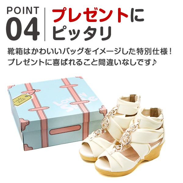 ヒールがあるので大人っぽく履きこなせます!憧れの女性に近づけます♪かかと部分にフィスナーが付いているので、脱ぎ履きもラクラクです。装飾のリングがキラキラ光って、おしゃれな足元を演出します。靴箱はかわいいバッグをイメージした特別仕様!プレゼントに喜ばれること間違いなしです♪