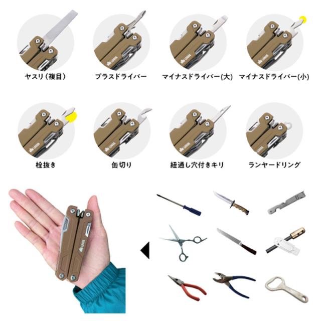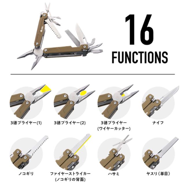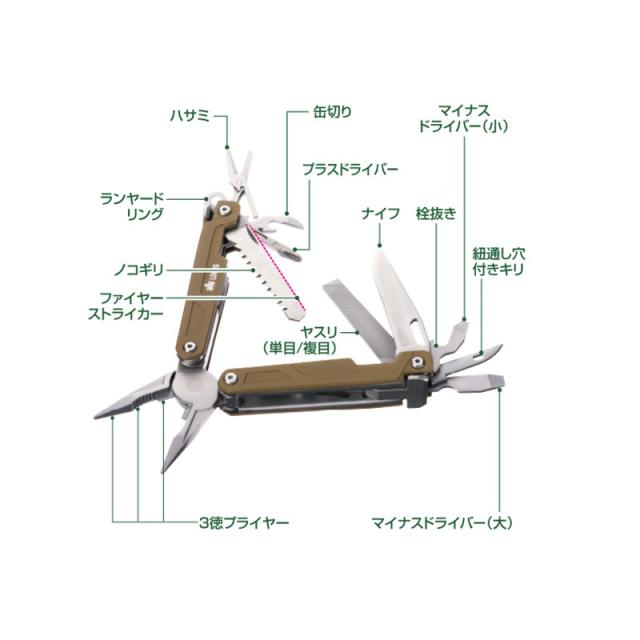 機能:3徳プライヤー 、ナイフ、ノコギリ、ハサミ、ヤスリ(単目/複目)、プラスドライバー、マイナスドライバー(大/小)、栓抜き、缶切り、紐通し穴付きキリ、ファイヤーストライカー、ランヤードリング