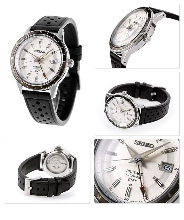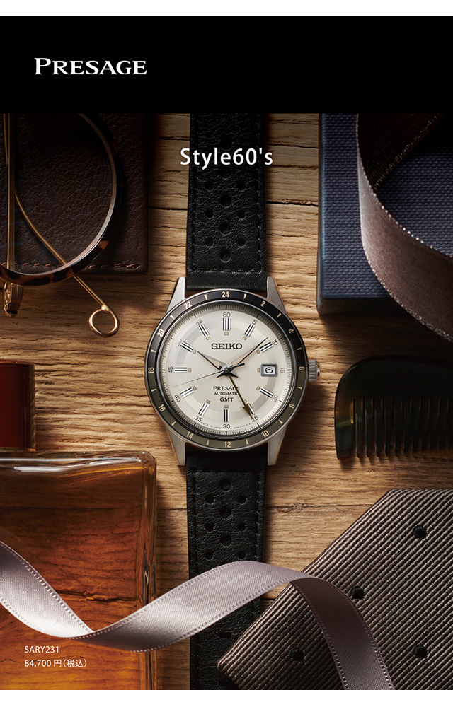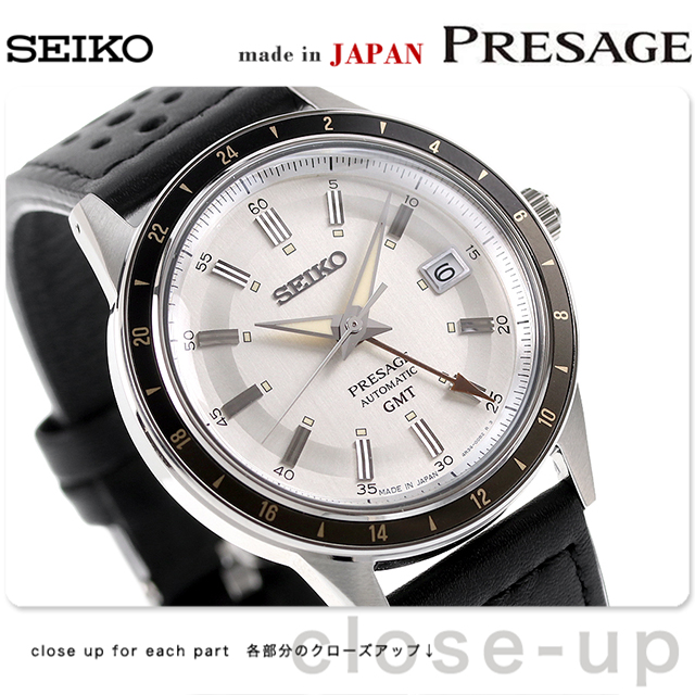 正規品 7年保証キャンペーン 送料無料 セイコー プレザージュ ベーシックライン 日本製 自動巻き メンズ 腕時計 SARY231 SEIKO PRESAGE Basic line Style60's アナログ メタリックオフホワイト ブラック 黒 革ベルト ◆2021年のデビュー以来、ヴィンテージの魅力を追求し続けてきたStyle60's。2023年は”Journey on the road”をテーマに掲げ、愛着溢れるヴィンテージカーでのツーリングを連想させるGMTモデルを投入。ヴィンテージカーの愛着を生み出す、華奢なステアリングやレバー類、精緻な印象の計器から着想を得た顔立ちが最大の特徴。今回新たに作成したGMTのダイヤルレイアウトは、クラウンクロノグラフのディテールを取り入れStyle60'sとしてのシリーズ感も踏襲。カラーリングは60年代のツーリングカーの塗色として世界的に流行したメタリック系のボディ色を参考に展開。新開発の粗い縦筋目の仕上げを組み合わせることで、ヴィンテージカー特有の金属感、マシン感満載の雰囲気を醸し出す。 発売日:2023年5月発売 機械式腕時計
