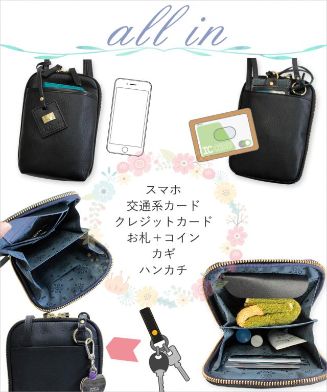 これ一つでスマートフォン、お金、カード、鍵、交通系ICカード、ハンカチ等必要最低限のアイテムをコンパクトに収納できます。