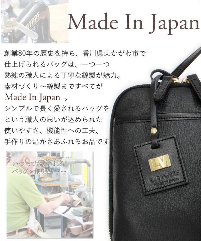 | ブランドについて | ライムのバッグは洗練された熟練の職人の方々の手作業により1本、1本丁寧に真心をこめて仕上げられています。 生産工場は香川県にあり全ての商品が国内生産。 日本でも希少なバッグ生産ラインを有し、クオリティを追求し続ける姿に誰もが感銘を受けるでしょう。 バッグ工房クレオは出会いました。 素敵なバッグに 素敵な職人さんに・・ |