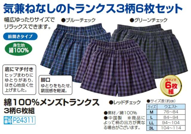 綿100% メンズトランクス 3柄6枚組 下着 パンツ トランクス メンズ 紳士服 シニア 男性 ブルー レッド グリーン チェック シンプル 肌着 インナー 40代 50代 60代 70代 80代 父の日 お父さん cer p24311