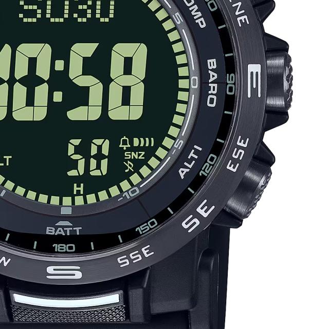 バンドは、環境に配慮したバイオマスプラスチック素材のソフトウレタンバンドとなっています。ケースと樹脂製の裏蓋にもバイオマスプラスチックを使用し、軽量化を図りました。また、蒸れを防ぐスリット穴を設け腕への装着性を向上しました。時計右側に方位、気圧/温度、高度をワンプッシュで計測できる大型のダイレクトボタンを配し、計測結果を数値でデジタル表示。各ボタンの近くに、瞬時に機能を認識できるよう方位・気圧・高度を示す機能表記を採用し、過酷なアウトドアシーンにおいても、直感的に必要な情報を計測、把握できます。また、STN液晶やボールドフォントを採用し視認性を向上させています。