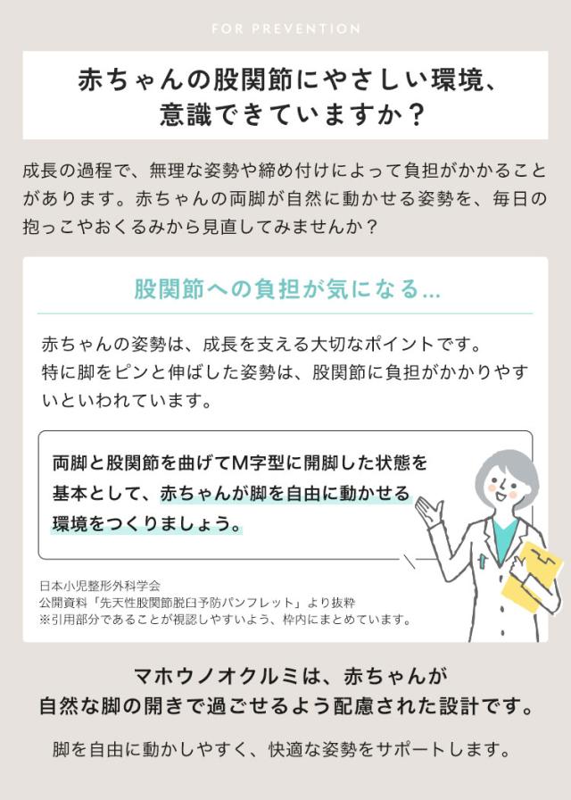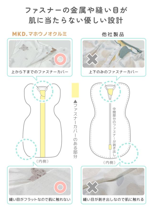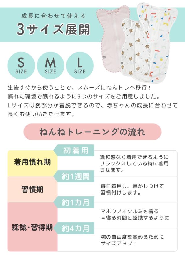| 【商品説明】 保育士監修のもと日本企業がプロデュースした『マホウノオクルミ』 赤ちゃんが理想の体型でぐっすりと眠れるように、自然と手がW、足がM字になる形のおくるみです。 手がすっぽりと覆われるので、指しゃぶりや顔の引っ掻きを防ぎます。股関節の発達をサポートできるよう足元にはたっぷりと余裕を持たせたデザインです。 成長に合わせて使える3サイズ展開です。 【サイズ】 Sサイズ:丈57cm × えりぐり10cm × 肩幅31cm × 胴幅22cm × 脚幅31cm Mサイズ:丈60cm × えりぐり10.5cm × 肩幅33cm × 胴幅22cm × 脚幅32cm Lサイズ:丈70cm × えりぐり11cm × 肩幅34cm × 胴幅23.5cm × 脚幅34cm ※現在販売している「手を出さないタイプのLサイズ」は売り切れ次第終了となります。 【カラー】 ピンク、イエロー、ブルー、オヤツ、クマサン、キョウリュウサン、ホシ、ツミキ、ピンク花柄 【素 材】 メッシュ、ノーマル:綿100% バンブーメッシュ:竹繊維70%、綿30% |