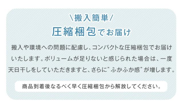 ※コンパクトな梱包でのお届けとなります。開封直後は、本来の厚みより薄くなっている場合がございますが、綿をほぐし、天日干しをして頂くと本来の厚みに戻りますので、ご安心ください。