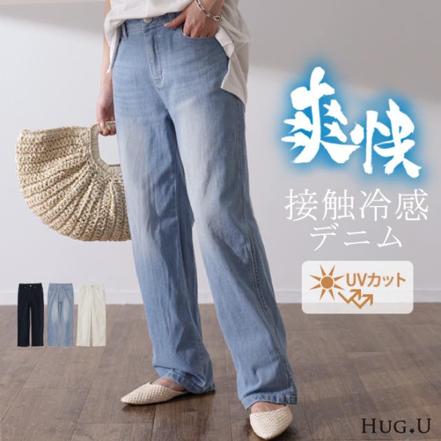 接触冷感 「 楽COOL デニム 」 ストレート デニムパンツ パンツ レディース ストレートデニム ジーンズ ジーパン ボトム ひんやり UV UVカット 速乾 ストレッチ スキニー 体型カバー ボトムス ズボン 脚長 ローライズ ワイドパンツ ワイド 冬 秋 HUG.U 夏新作