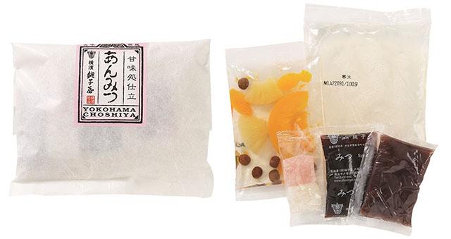 ・ 寒天に、小倉あん、沖縄黒糖使用の黒みつ、紅白の牛皮、赤えんどうのみつ豆、黄桃・みかん・パインを入れたフルーツをセット。