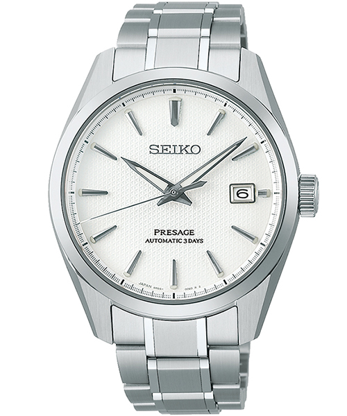 セイコー プレザージュ初となる、パワーリザーブ3日間(約72時間)のメカニカルムーブメント「6R5J」を搭載。その証として、ダイヤルに「AUTOMATIC 3DAYS」を表記しています。最大に巻き上げた状態で金曜日に外し、週末に着用せずとも、翌月曜日にそのまま使用可能な実用性を備えています。