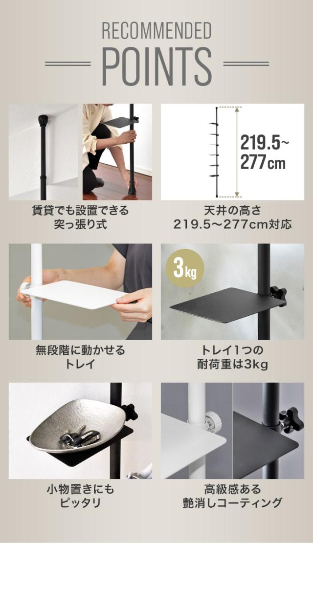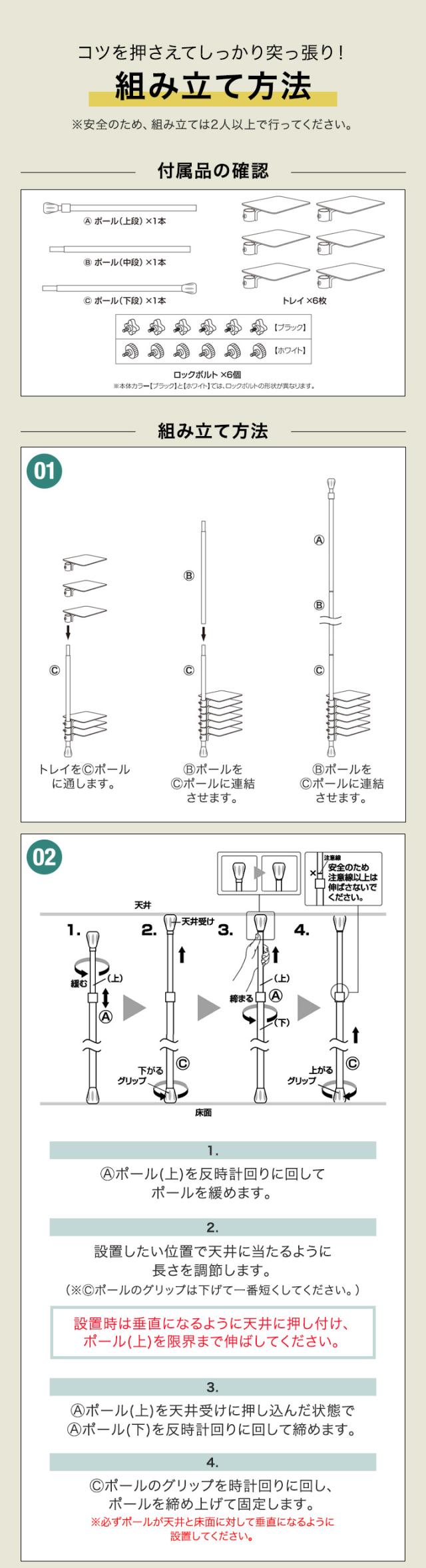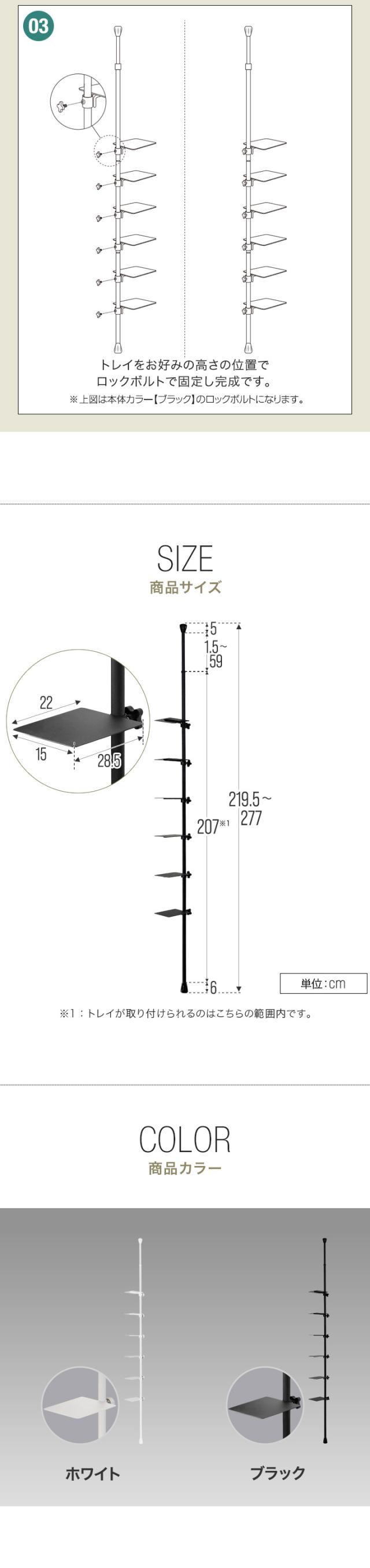 | セット内容: ・突っ張り式ポール×1本 ・トレイ×6枚 ・ロックボルト×6個 |