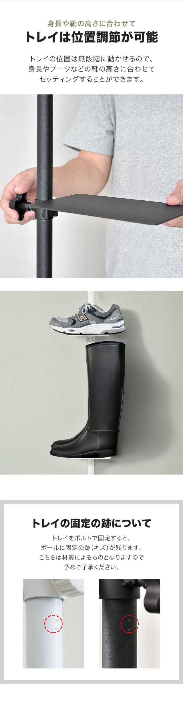 - 玄関のドアの隅にサンダルなど、ちょっと外に出る時に履きたいもねを置くために購入した。 靴などを置く棚部分が写真ではペラペラで大丈夫かなと思ってたら、ガッチリした鉄製でピックリ。 突っ張りする機構が若干弱いかなとは思うが、省スペースで満足している。