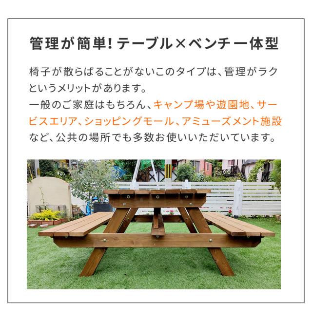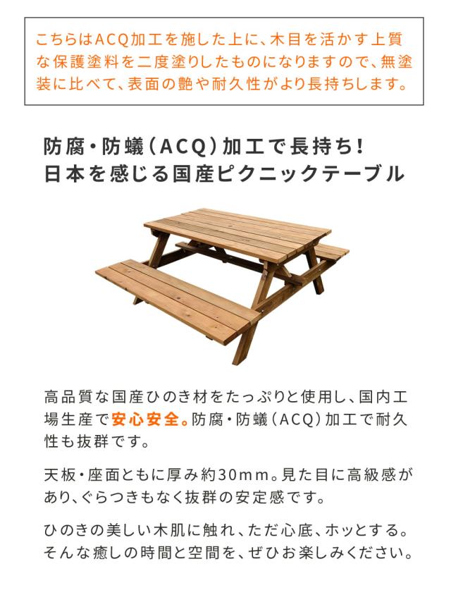 高品質な国産ひのき材をたっぷりと使用。日本国内の工場生産で安全安心。防腐 防蟻 ACQ加工 ピクニックテーブル ベンチテーブル テーブルベンチ