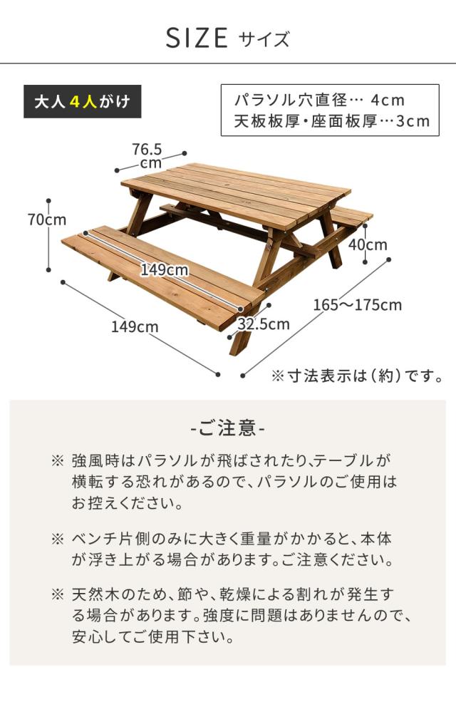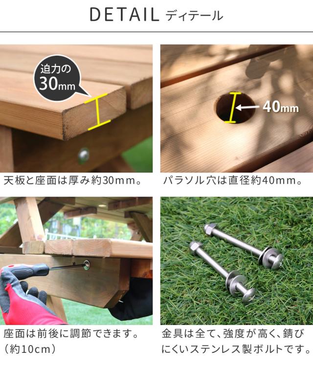 ガーデンテーブル ピクニックテーブル 木製 ガーデンチェア 4人 屋外 穴 椅子 テーブル ガーデン パラソル おしゃれ ガーデンテーブルテーブルベンチ一体型 ガーデンチェアセット ガーデンセット テラス 庭 外 ベランダ
