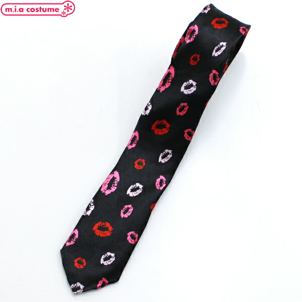 1307D■【送料無料・即納】B品 ネクタイ 細身口付け柄 色:黒地×赤白ピンク ブラック リップ柄 口紅 ポップ スクール カジュアル オシャレ ハロウィン コスプレ