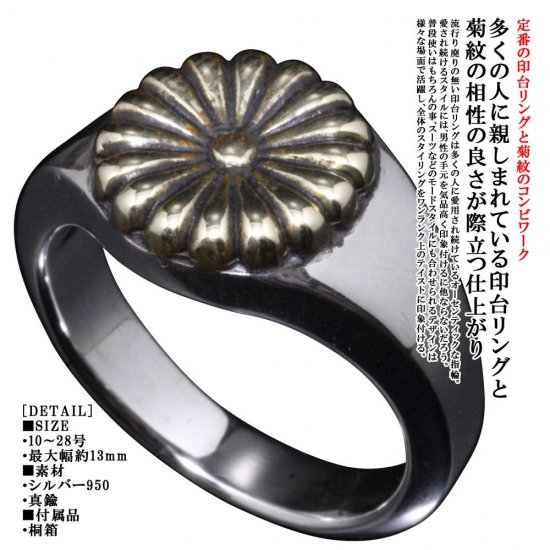 (シルバーアクセサリーシルバージュエリー シルバーブランド シルバー シルバーリング 指輪 シルバー950 メンズリング 日本 和風 和柄 伝統技法 日本製 国内 国産 made in JAPAN メイドインジャパン ドメスティック 親指 人差指 人差し指 中指 薬指 小指 菊 菊紋 菊十六紋 菊の御紋 紋章 愛国 ごつい 印台 印台リング シールリング シグネットリング スタンプリング 家紋 真鍮 ブラス ゴールドカラー 金色 花 フラワー 植物 10号 11号 12号 13号 14号 15号 16号 17号 18号 19号 20号 21号 22号 23号 24号 25号 26号 27号)