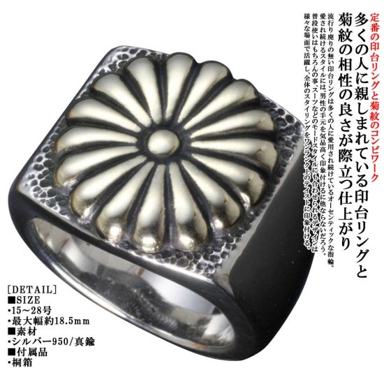 (シルバーアクセサリーシルバージュエリー シルバーブランド シルバー シルバーリング 指輪 シルバー950 メンズリング 日本 和風 和柄 伝統技法 日本製 国内 国産 made in JAPAN メイドインジャパン ドメスティック 親指 人差指 人差し指 中指 薬指 小指 菊 菊紋 菊十六紋 菊の御紋 紋章 愛国 ごつい 印台 印台リング シールリング シグネットリング スタンプリング 家紋 真鍮 ブラス ゴールドカラー 金色 花 フラワー 植物 15号 16号 17号 18号 19号 20号 21号 22号 23号 24号 25号 26号 27号 28号)