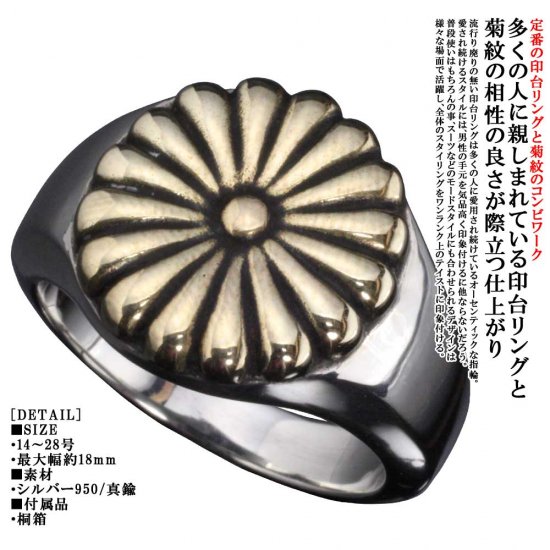 (シルバーアクセサリーシルバージュエリー シルバーブランド シルバー シルバーリング 指輪 シルバー950 メンズリング 日本 和風 和柄 伝統技法 日本製 国内 国産 made in JAPAN メイドインジャパン ドメスティック 親指 人差指 人差し指 中指 薬指 小指 菊 菊紋 菊十六紋 菊の御紋 紋章 愛国 ごつい 印台 印台リング シールリング シグネットリング スタンプリング 家紋 真鍮 ブラス ゴールドカラー 金色 花 フラワー 植物 14号 15号 16号 17号 18号 19号 20号 21号 22号 23号 24号 25号 26号 27号 28号)