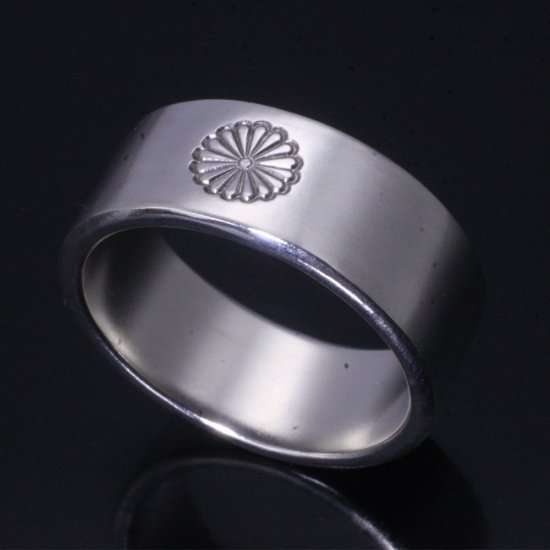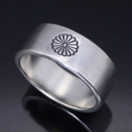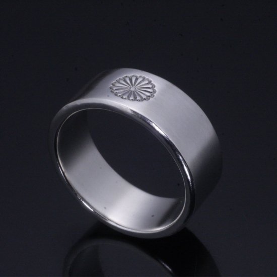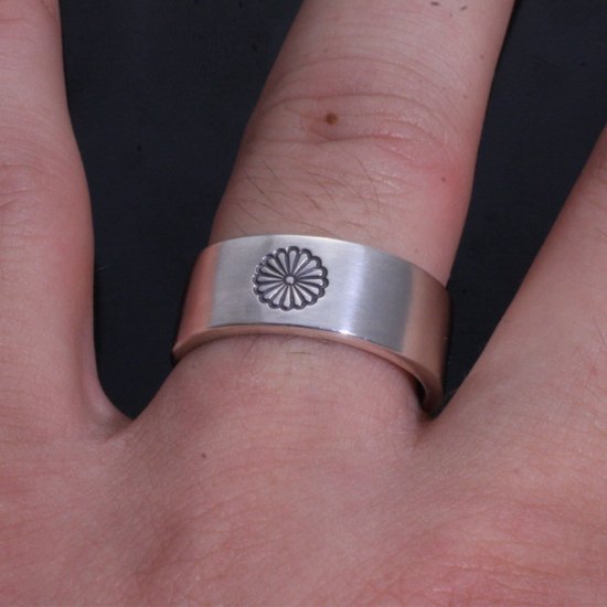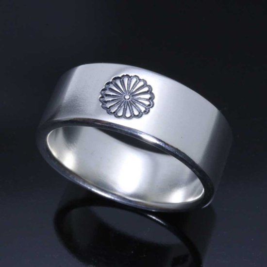 平打ちリングの中央に菊紋を刻印したシンプルなデザイン。