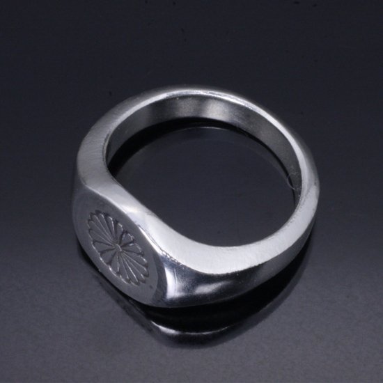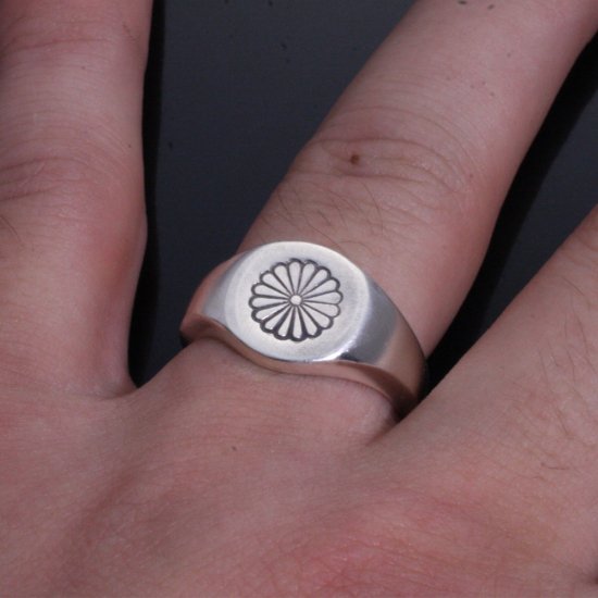 ベーシックな印台リングに菊の刻印を施したリング。