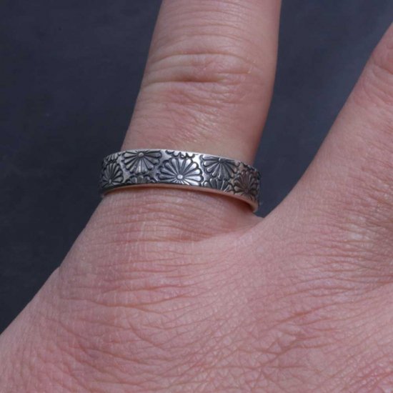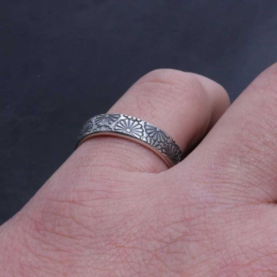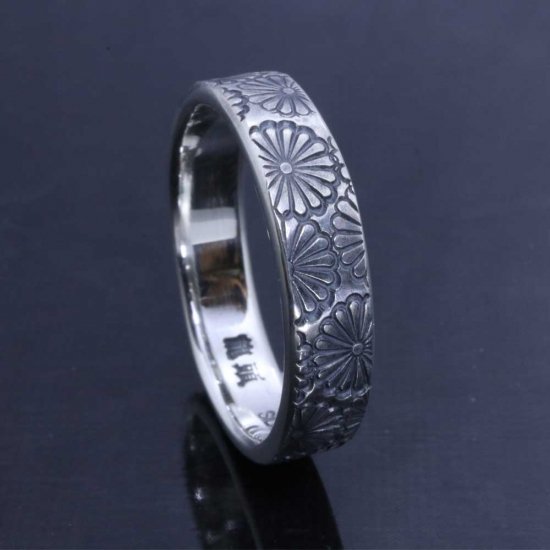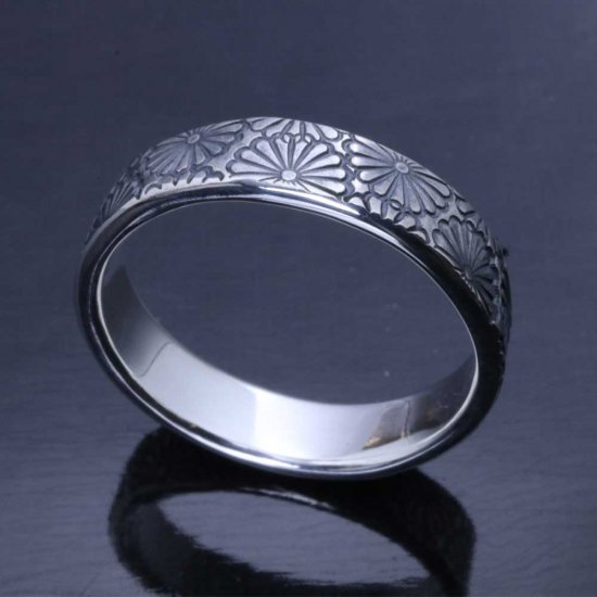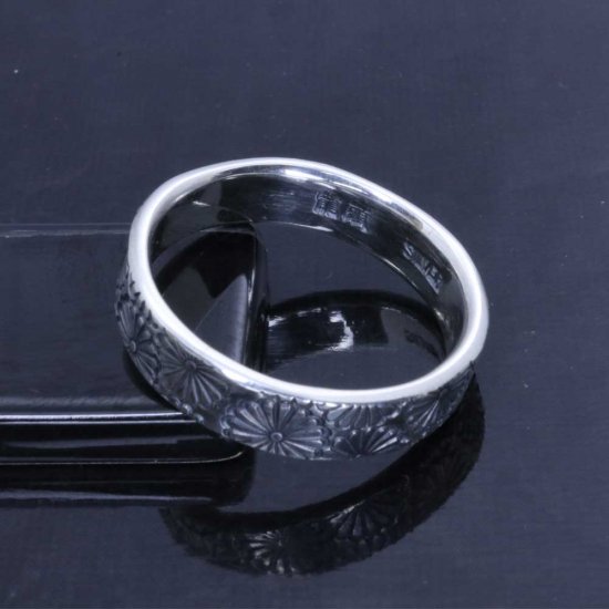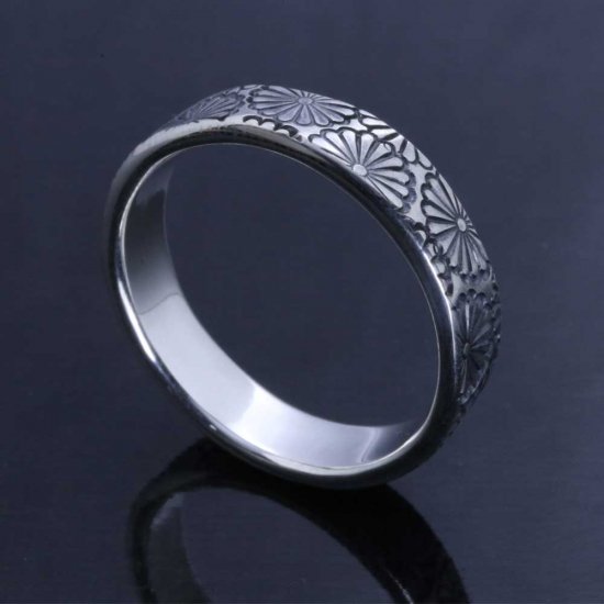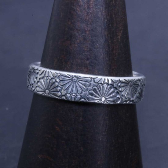 菊紋を指輪いっぱいにスタンプワークしたシルバーリング。