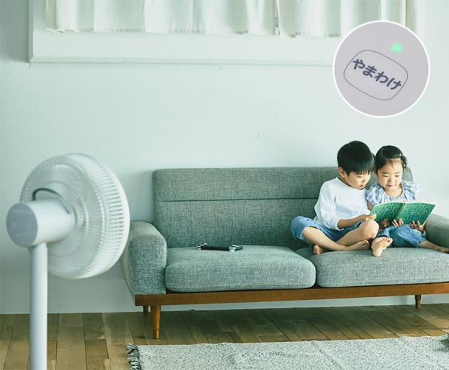 欲しい範囲だけに風を送る「やまわけ」機能も搭載。3人でソファーに座っている時など、人がいる範囲のみ首振りを行なってくれるので、効率的な送風を可能とします。複数人で涼みたい時や、リビングで家族が離れた場所でそれぞれくつろぐ時などにお使いいただけます。