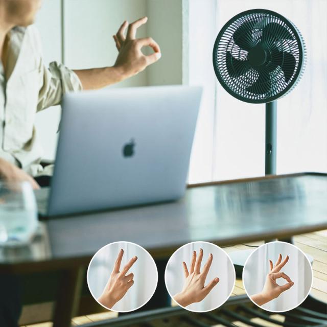 「まる」「ちょき」「ぱー」の3つのハンドサインで、電源のON/OFF、風量UP、首振りのON/OFFが可能です。リモコンが付属しますが、手元にリモコンがない時でも簡単に遠隔操作ができます。