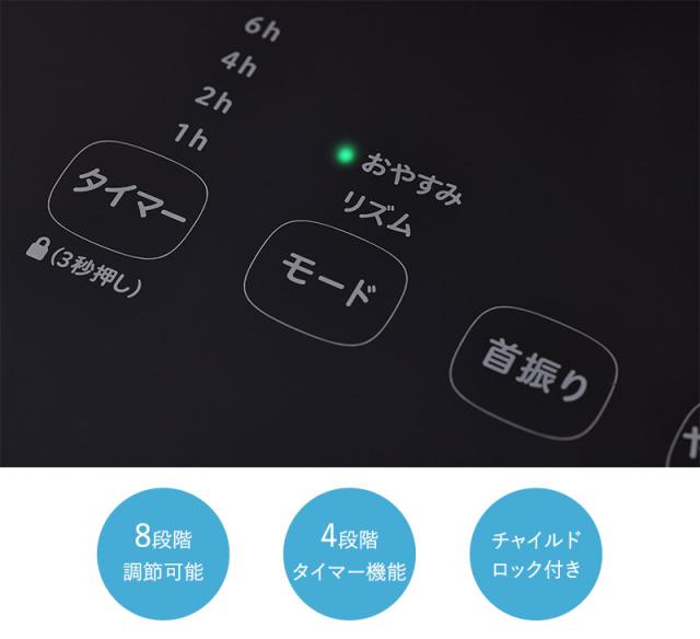おやすみ・リズムの2モード搭載。風量は8段階と細かく設定可能です。