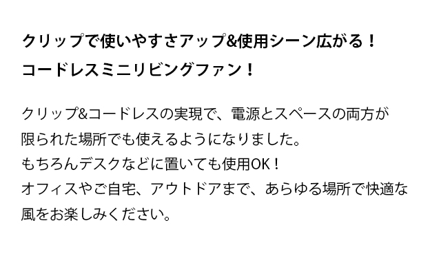 クリップ&コードレスの実現で、電源とスペースの両方が限られた場所でも使えるようになりました。もちろんデスクなどに置いても使用OK!オフィスやご自宅、アウトドアまで、あらゆる場所で快適な風をお楽しみください。