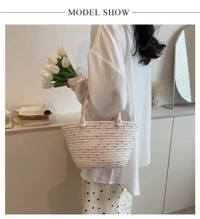 | シーズンムードを高めるロープ素材の編みバッグ。 編みで柄を表現したオリジナリティーあるアイテム 春から秋まで多シーズン使用できるアイテム メインバッグ部分だけでなく、持ち手も編みで表現 サイズも大きすぎず小さすぎず、使い勝手の良い大きさ。デイリーユースはもちろん、お買い物や旅行にもおすすめで、持っているだけで気分が上がります | |
